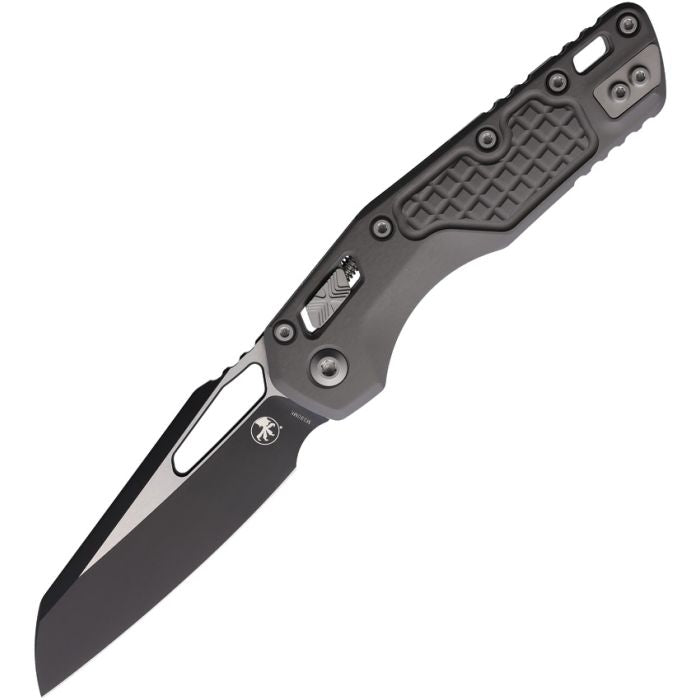 5" (12.7cm) closed. 3.75" (9.53cm) two-tone finish Bohler M390MK stainless sheepsfoot blade. Gray frag pattern aluminum handle. Thumb pull. Lanyard hole. Pocket clip. Boxed.