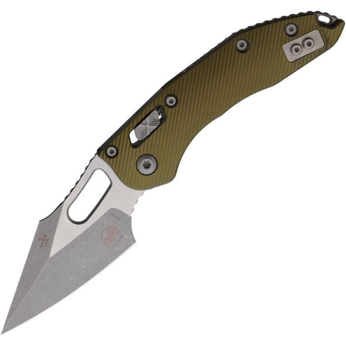 5" (12.7cm) closed. 3.75" (9.53cm) Apocalyptic finish Bohler M390MK stainless blade. OD green fluted aluminum handle. Thumb pull. Lanyard hole. Pocket clip. Boxed.